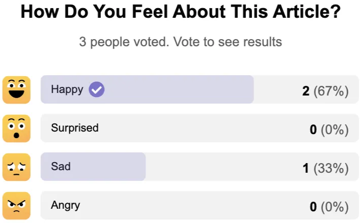 Reactions as Polls enables interactive, in-article sentiment tracking. Users can vote on a single reaction and instantly see how others have responded.